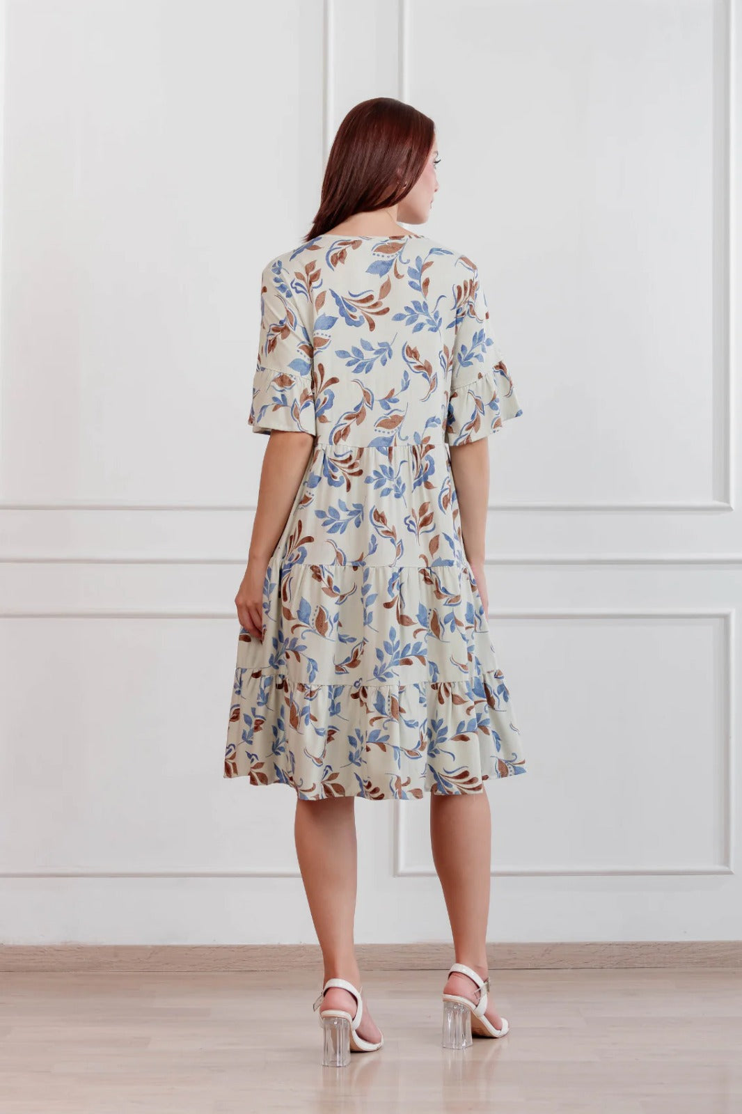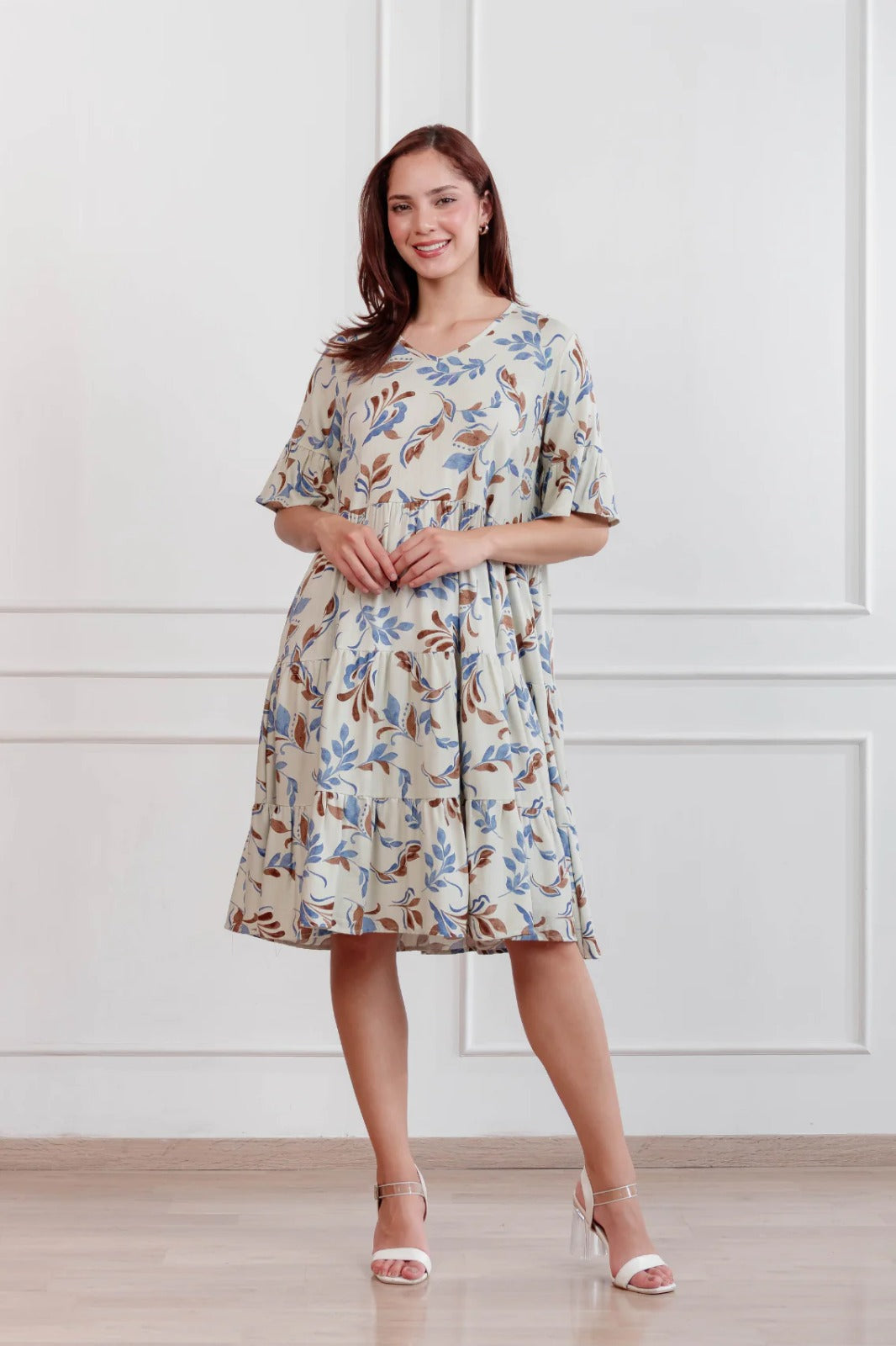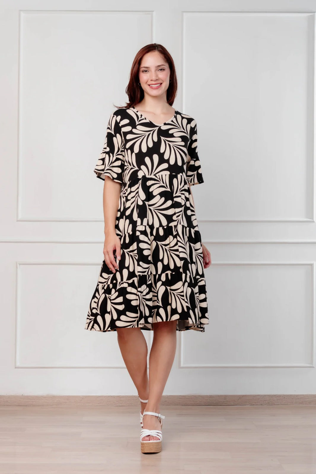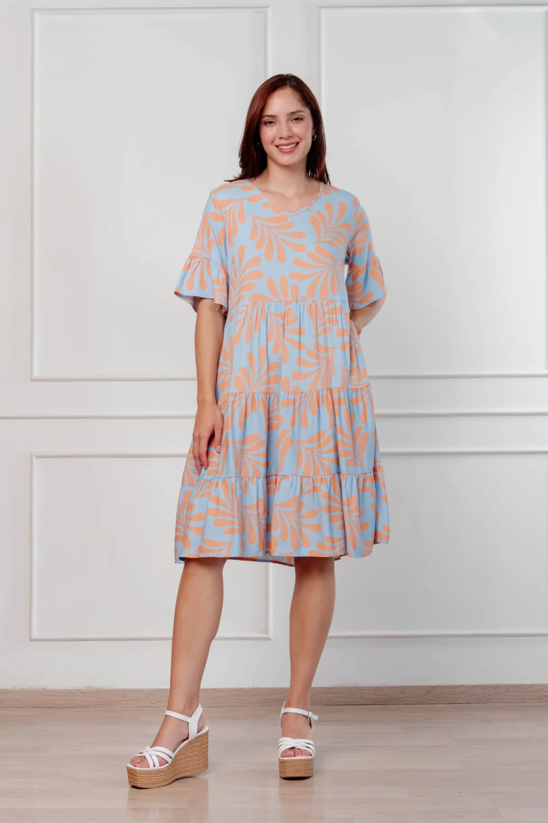 De estilo fresco y casual, es ideal para cualquier ocasión. Su fit es entallado en el torso y se abre en una falda de caída amplia, fluida y relajada.